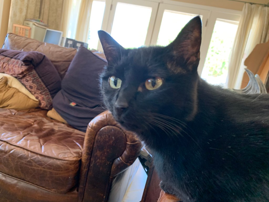 Shadow is now our oldest cat. She is jet-black and bad-tempered except when it comes to Luna, our smallest cat. With Luna, she is homicidal. With the others, she’s just mean, particularly right before dinner. She’ll bat any other cat who comes within striking distance including her own two daughters who were adopted at the same time. On the other hand, she is very affectionate to humans and loves to sit in my lap and be petted.